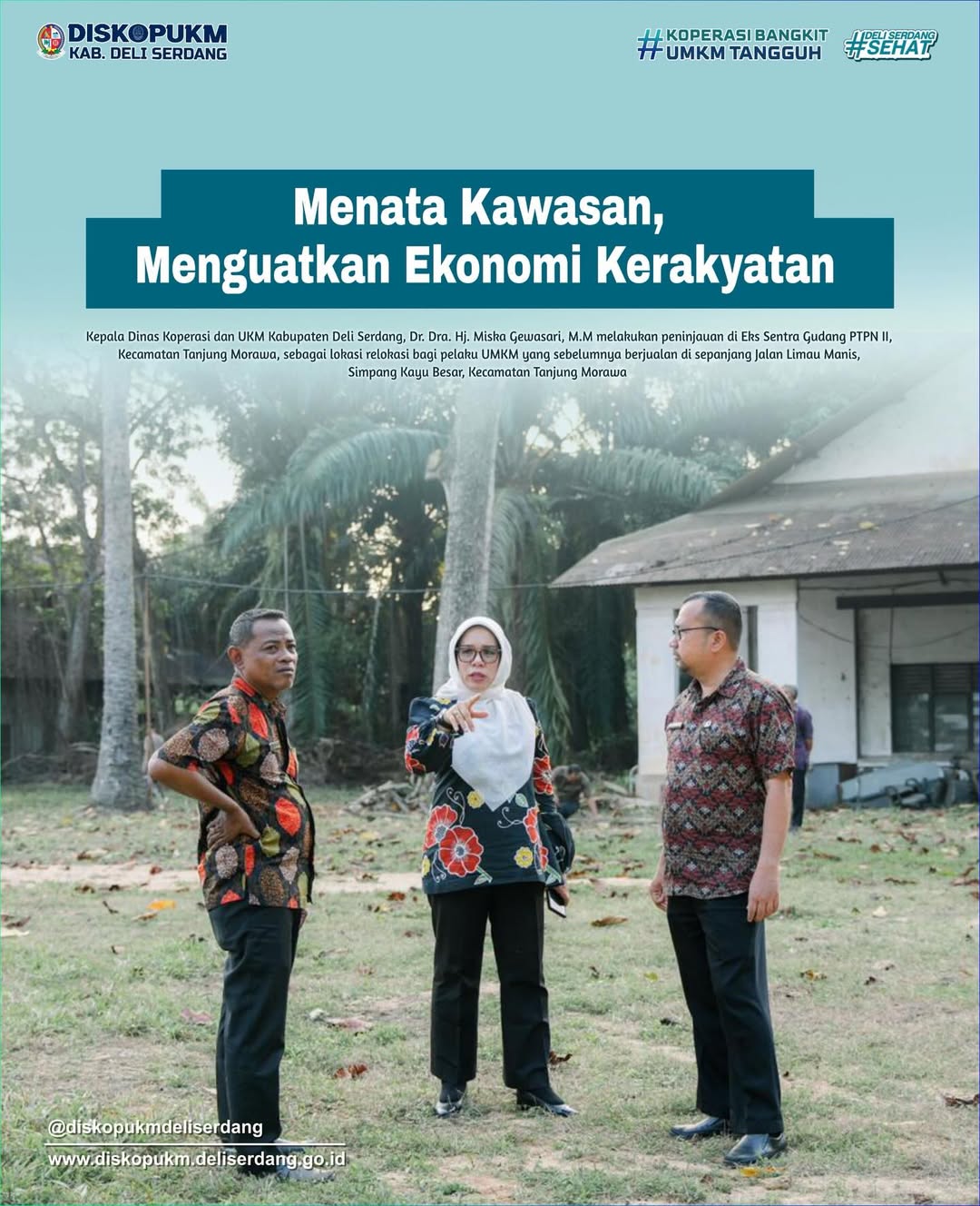 Kamis, (26/03/2026), Kepala Dinas Koperasi dan UKM Kabupaten Deli Serdang, Dr. Dra. Hj. Miska Gewasari, M.M melakukan peninjauan di Eks Sentra Gudang PTPN II, Kecamatan Tanjung Morawa, sebagai lokasi relokasi bagi pelaku UMKM yang sebelumnya berjualan di sepanjang Jalan Limau Manis, Simpang Kayu Besar, Kecamatan Tanjung Morawa.