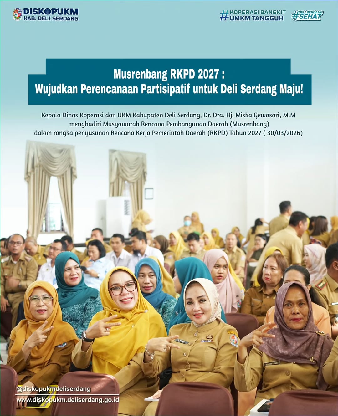 Kepala Dinas Koperasi dan UKM Kabupaten Deli Serdang Dr. Dra. Hj. Miska Gewasari, M.M menghadiri Musyawarah Rencana Pembangunan Daerah (Musrenbang) dalam rangka Penyusunan Rencana Kerja Pemerintah Daerah (RKPD) Kabupaten Deli Serdang Tahun 2027 yang dilaksanakan di Aula Cendana Lt. II Kantor Bupati Deli Serdang, Senin (30/03/2026).