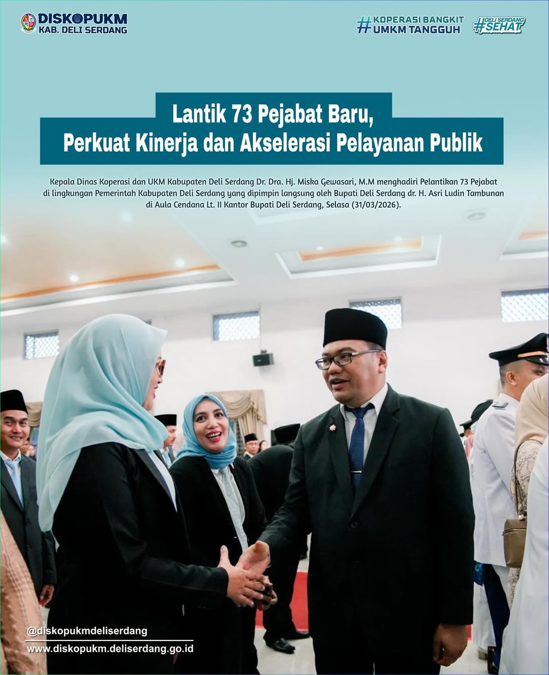 Kepala Dinas Koperasi dan UKM Kabupaten Deli Serdang Dr. Dra. Hj. Miska Gewasari, M.M menghadiri Pelantikan 73 Pejabat di lingkungan Pemerintah Kabupaten Deli Serdang yang dipimpin langsung oleh Bupati Deli Serdang dr. H. Asri Ludin Tambunan di Aula Cendana Lt. II Kantor Bupati Deli Serdang, Selasa (31/03/2026).