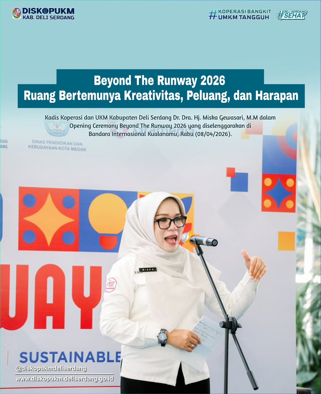 Hal tersebut disampaikan oleh Kadis Koperasi dan UKM Kabupaten Deli Serdang Dr. Dra. Hj. Miska Gewasari, M.M dalam Opening Ceremony Beyond The Runway 2026 yang diselenggarakan di Bandara Internasional Kualanamu, Rabu (08/04/2026).