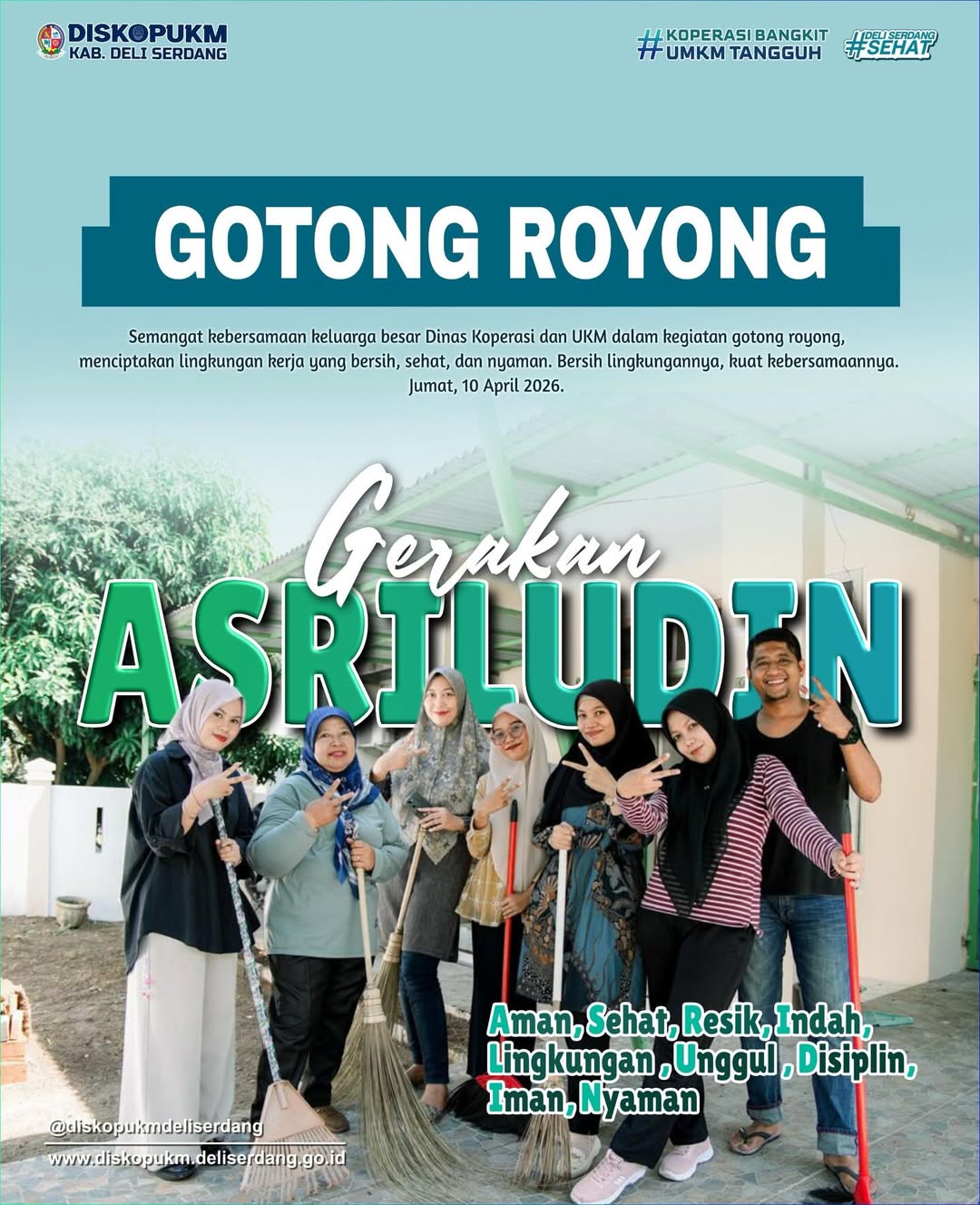 Dinas Koperasi dan UKM Kabupaten Deli Serdang melaksanakan kegiatan GERAKAN ASRI (Aman, Sehat, Resik, Indah) di lingkungan Rumah Dinas DisKopUKM, Jumat (10/04/2026), sebagai upaya menciptakan lingkungan yang bersih, tertata, dan nyaman.