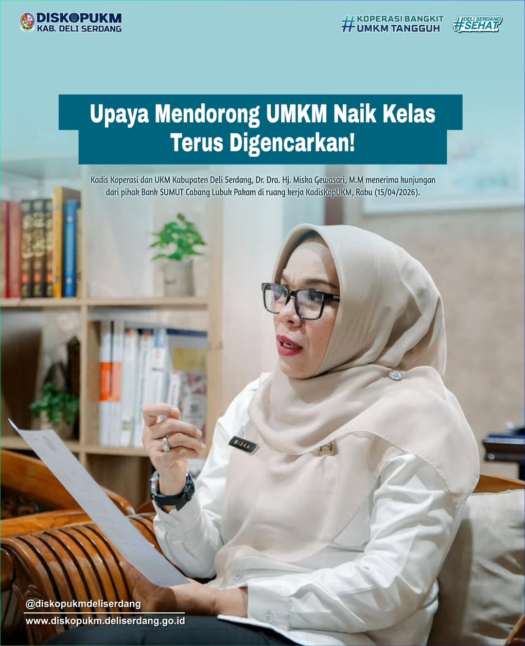 Kadis Koperasi dan UKM Kabupaten Deli Serdang, Dr. Dra. Hj. Miska Gewasari, M.M menerima kunjungan dari pihak Bank SUMUT Cabang Lubuk Pakam di ruang kerja KadisKopUKM, Rabu (15/04/2026).